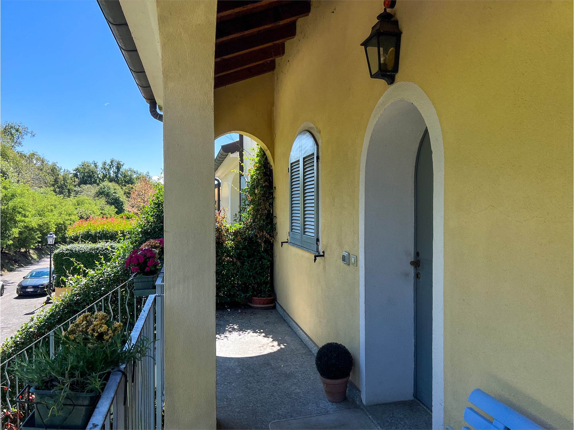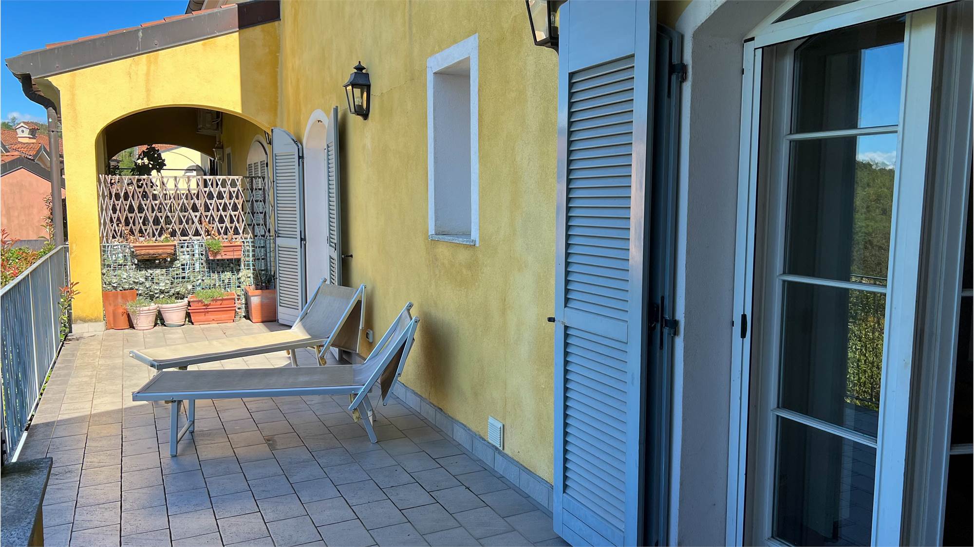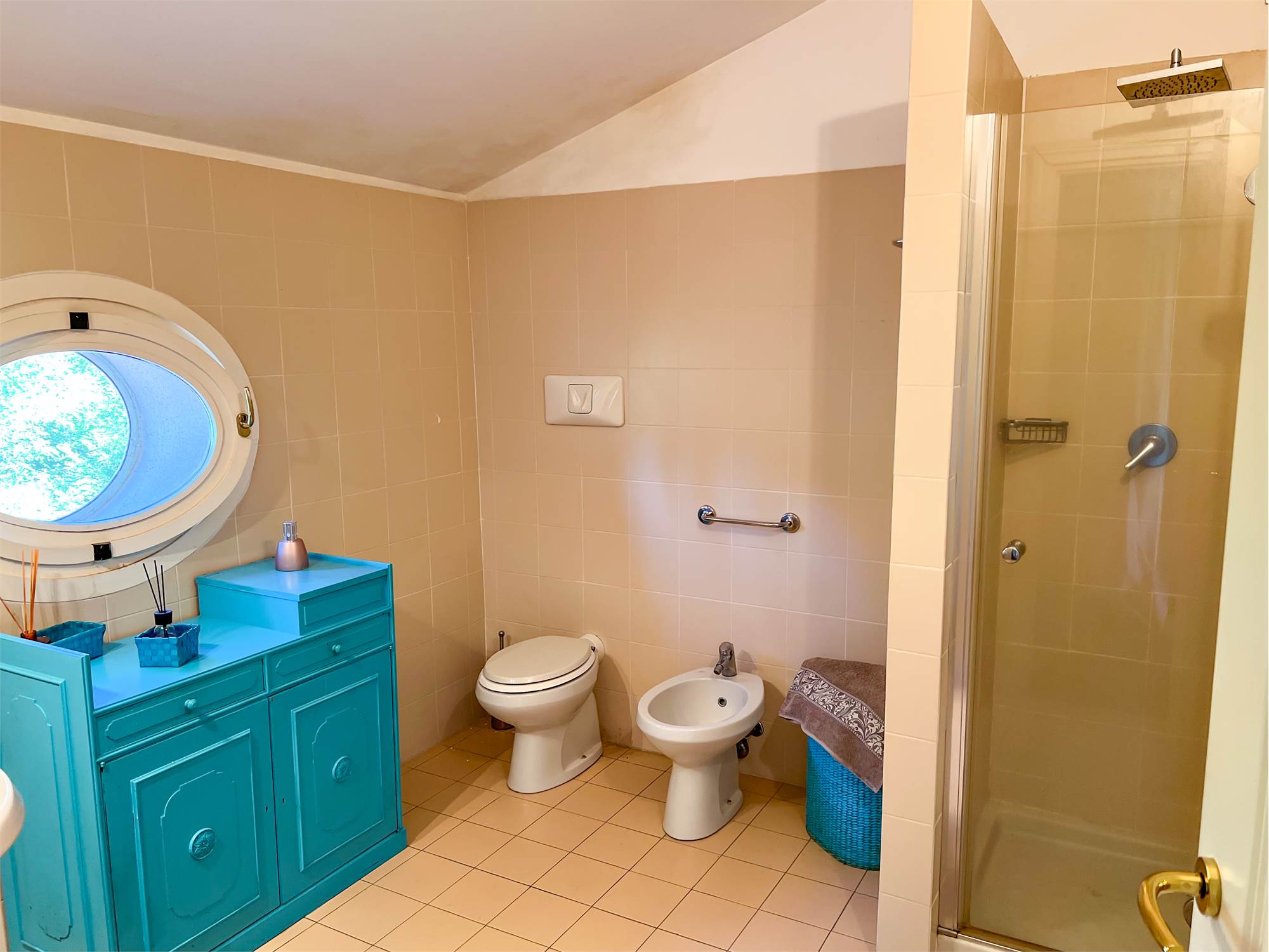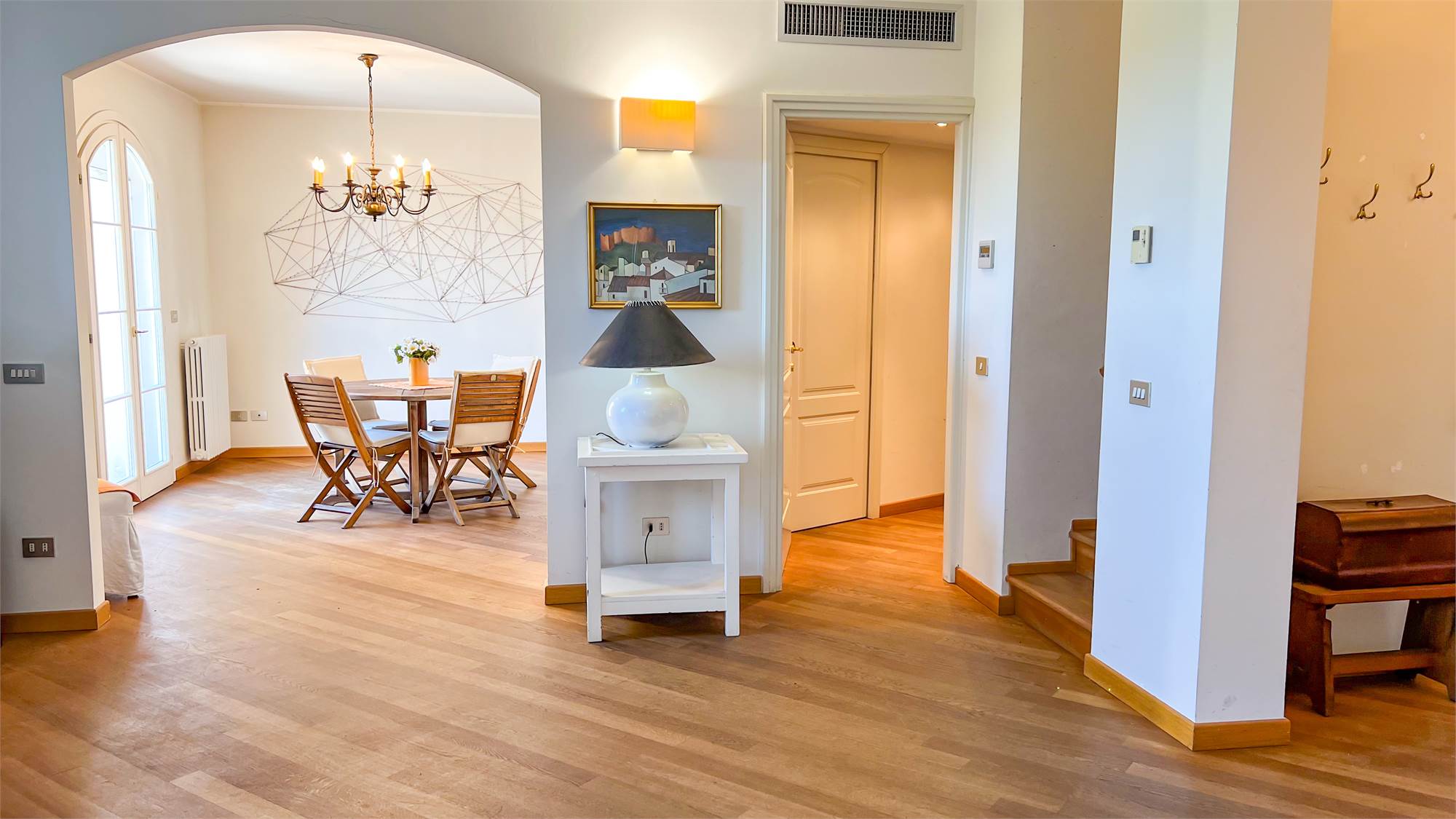 The second floor houses the sleeping area: the master bedroom features a walk-in closet and private bathroom; a hallway leads to a second bathroom and an additional room currently used as a hobby room, but also perfect as a bedroom or study. The rooms are particularly welcoming thanks to the parquet flooring and varying heights, which lend movement and personality to the spaces.