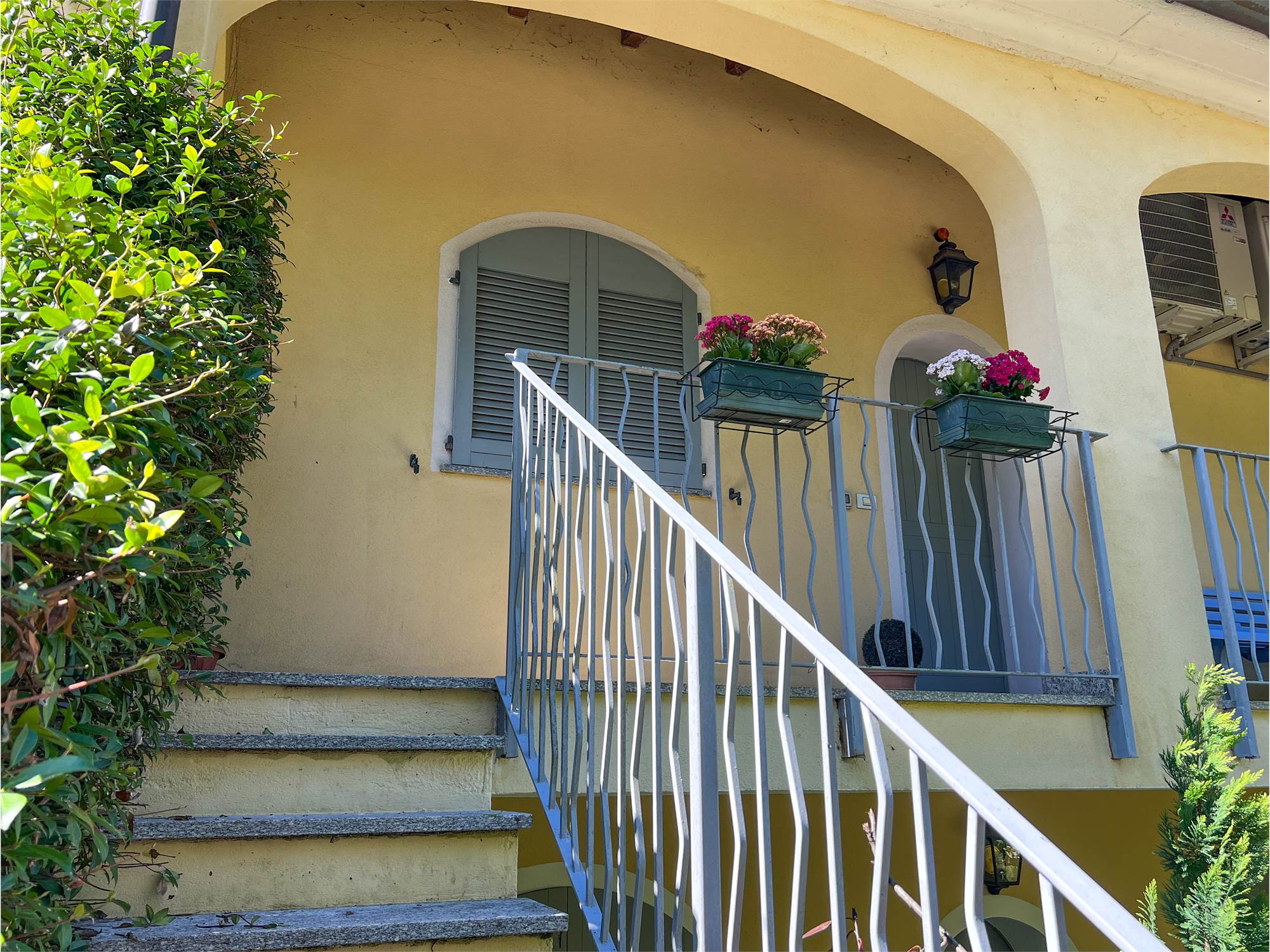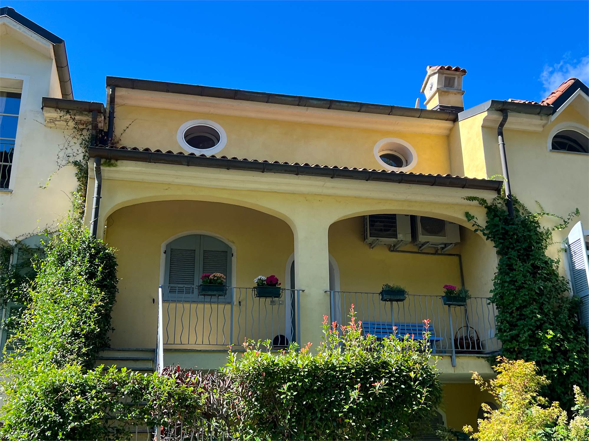 The apartment spans the first and second floors. On the first floor, the entrance leads to an elegant study on one side, and to a splendid open-plan living area with a fireplace, living area, and dining area on the other, enhanced by large windows that open to the outside. From here, you access the livable, partially covered, west-facing terrace: an ideal space for dining and relaxing with a panoramic view of the green. The bright, linear eat-in kitchen features a French window; a guest bathroom with shower and a practical storage closet complete this level. Thanks to the spaciousness of the space, the living area can easily be remodeled to create an additional bedroom if needed.